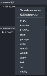 2.Maven:安装Maven for Java插件,Maven使用需要有JDK支持,使用Maven自身的settings文件,配置后在资源管理器下会有MAVEN项目分类,可右键执行相关操作: