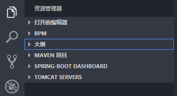 - 资源管理器:选择需要打开的文件/文件夹/项目(图中MAVEN等为插件扩展分类)。单击文件会临时打开文件,双击则固定在列表中。VSC只支持打开单一文件夹,如果需要同时打开多个项目,请放在同一根目录下(文件太多会影响启动效率)。