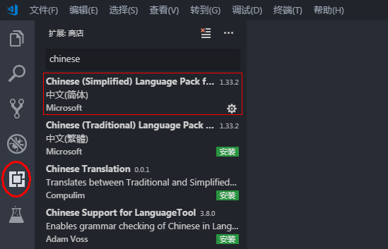 1.点击进入插件管理,搜索chinese,找到Chinese (Simplified) Language Pack for Visual Studio Code,点击安装